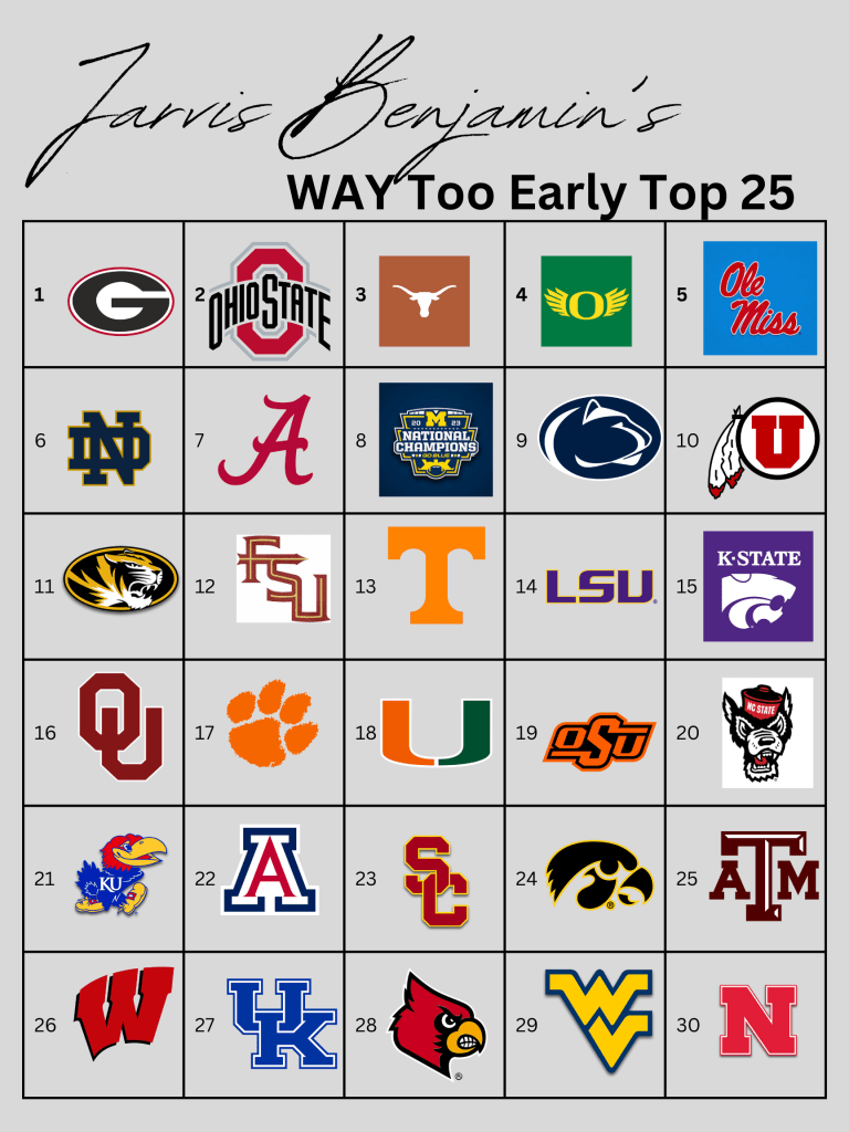 - LSU Tigers: Brian Kelly and co. certainly have their work cut out for themselves on the offensive side of the ball. Losing two stud wide receivers and the Heisman Trophy-winning quarterback is not going to be easy to overcome. Garrett Nussmeier is going to be the starter Day 1, and many people are very high on him. He and the Tigers are climbing uphill for sure. Kelly brought in a new defensive coordinator to try and help combat the issues they had last year paired with their NFL Draft subtractions. It’s very possible that this is the highest the Tigers are ranked this year. Geaux get ‘em.